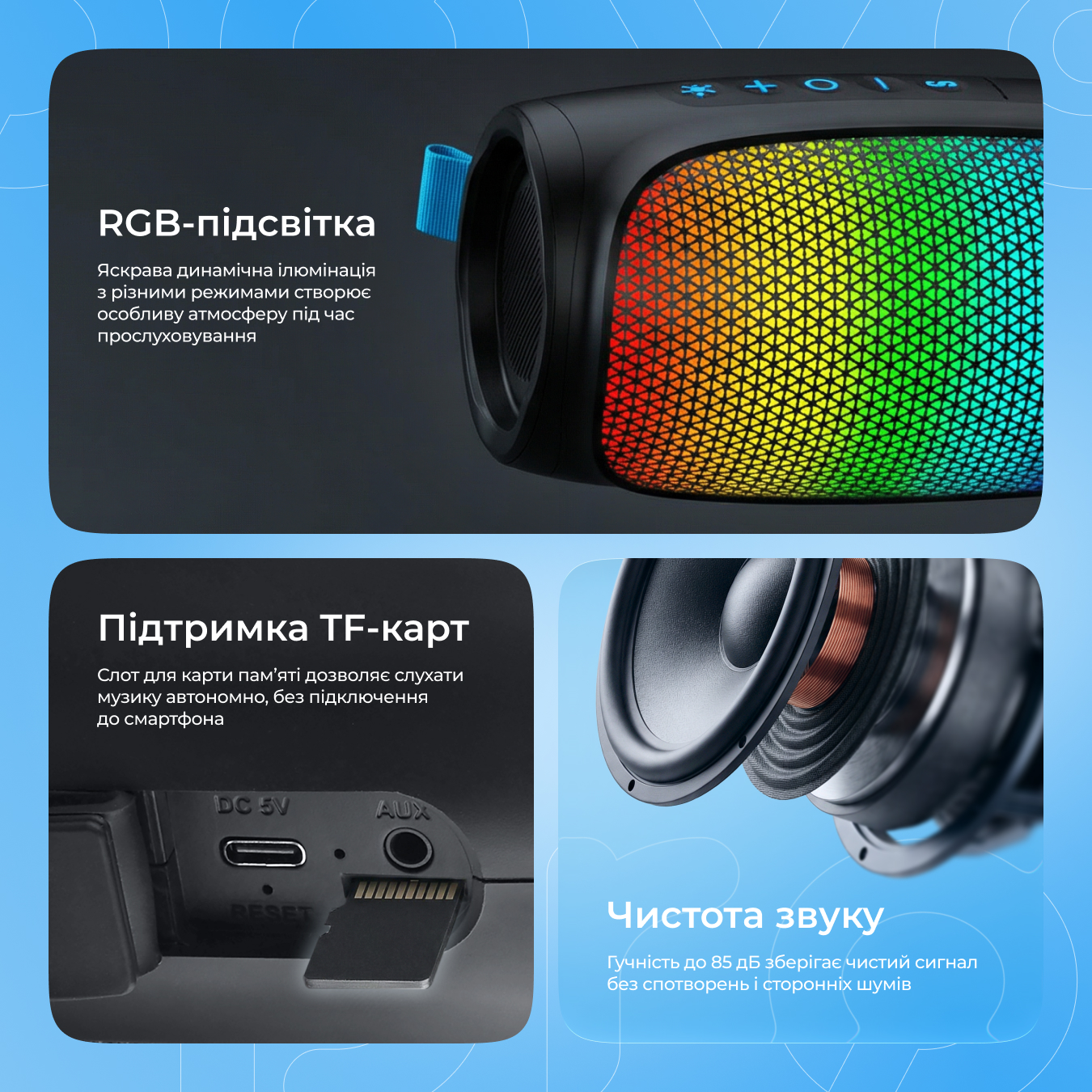 - Аудіо режим: BT, TF, AUX, TWS;