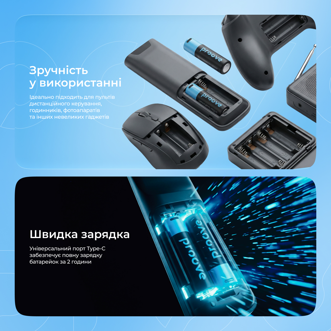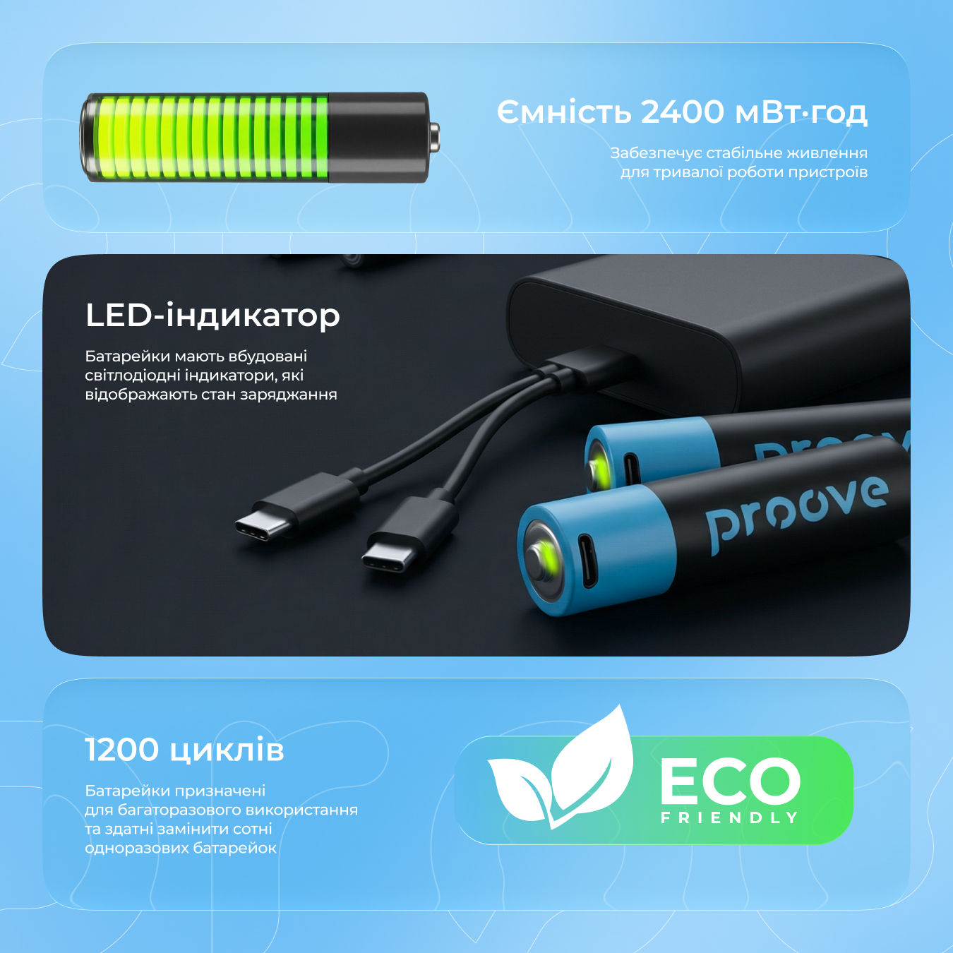 Proove Compact Energy має потужний акумулятор, який витримує до 1200 циклів зарядки. Оновити заряд можна через кабель Type-C з напругою до 5V. Батарейка здатна заживити будь-який пристрій з напругою до 1.5V: іграшка, клавіатура, пульт для телевізора і так далі.