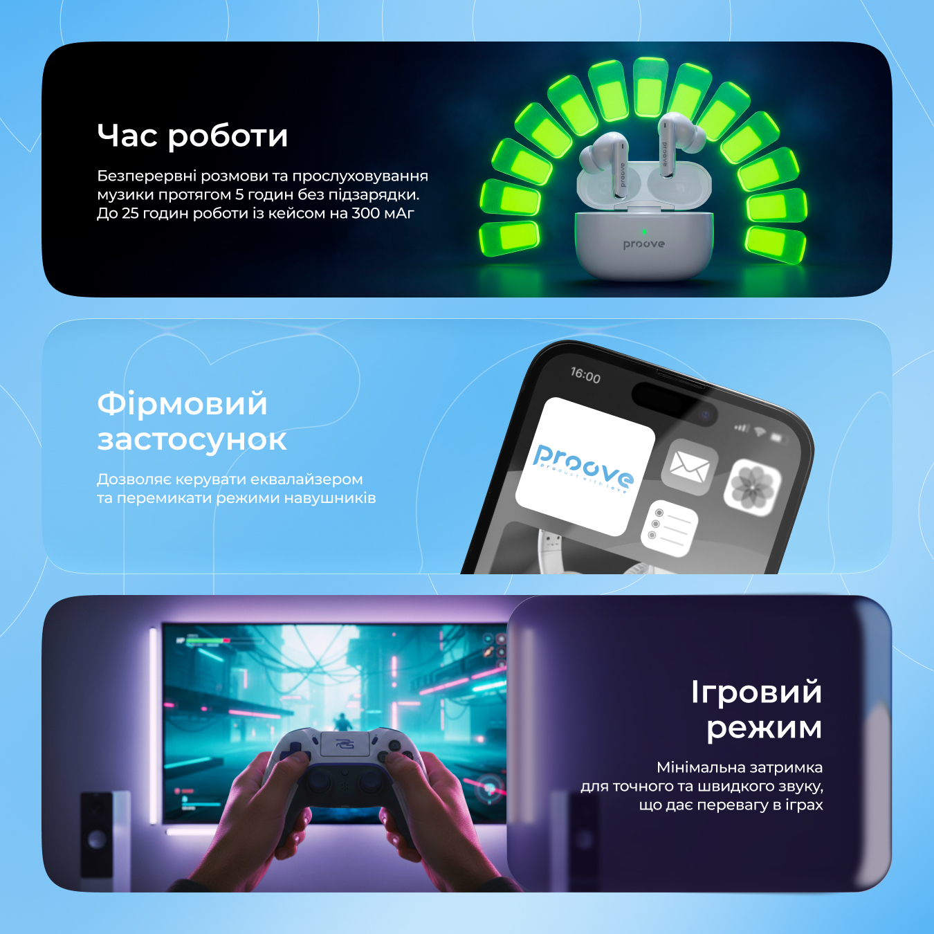 Навушники сумісні з фірмовим застосунком Proove, що відкриває розширені можливості налаштування. Користувачі можуть персоналізувати звучання через еквалайзер, змінювати елементи керування під власні вподобання, регулювати ANC, Game Mode, режим прозорості та багато іншого.