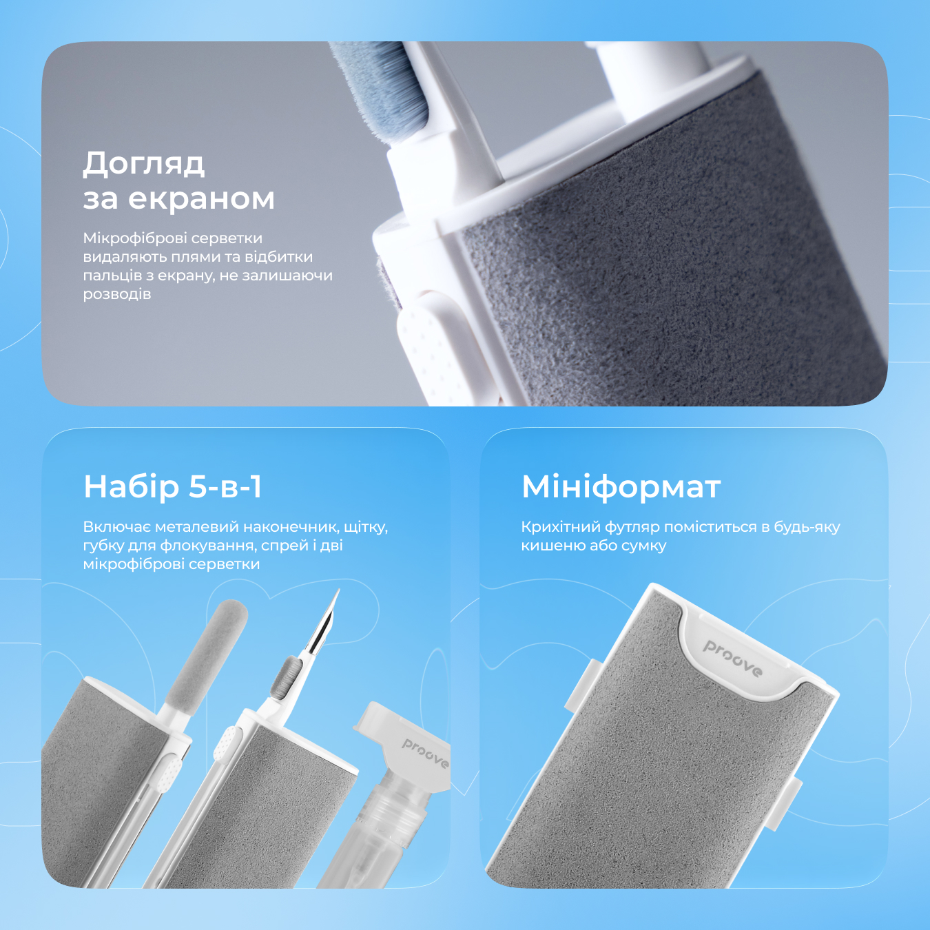 Набір має невеликий розмір, але незважаючи на це налічує в собі 5 функціональних рішень, які забезпечать усім необхідним. Вони потрібні для очищення навушників і важкодоступних місць на ваших смартфонах, а також для оптимального очищення клавіатури. Ці засоби допоможуть вам ефективно видалити пил, бруд та інші забруднення, зберігаючи вашу техніку в ідеальному стані.