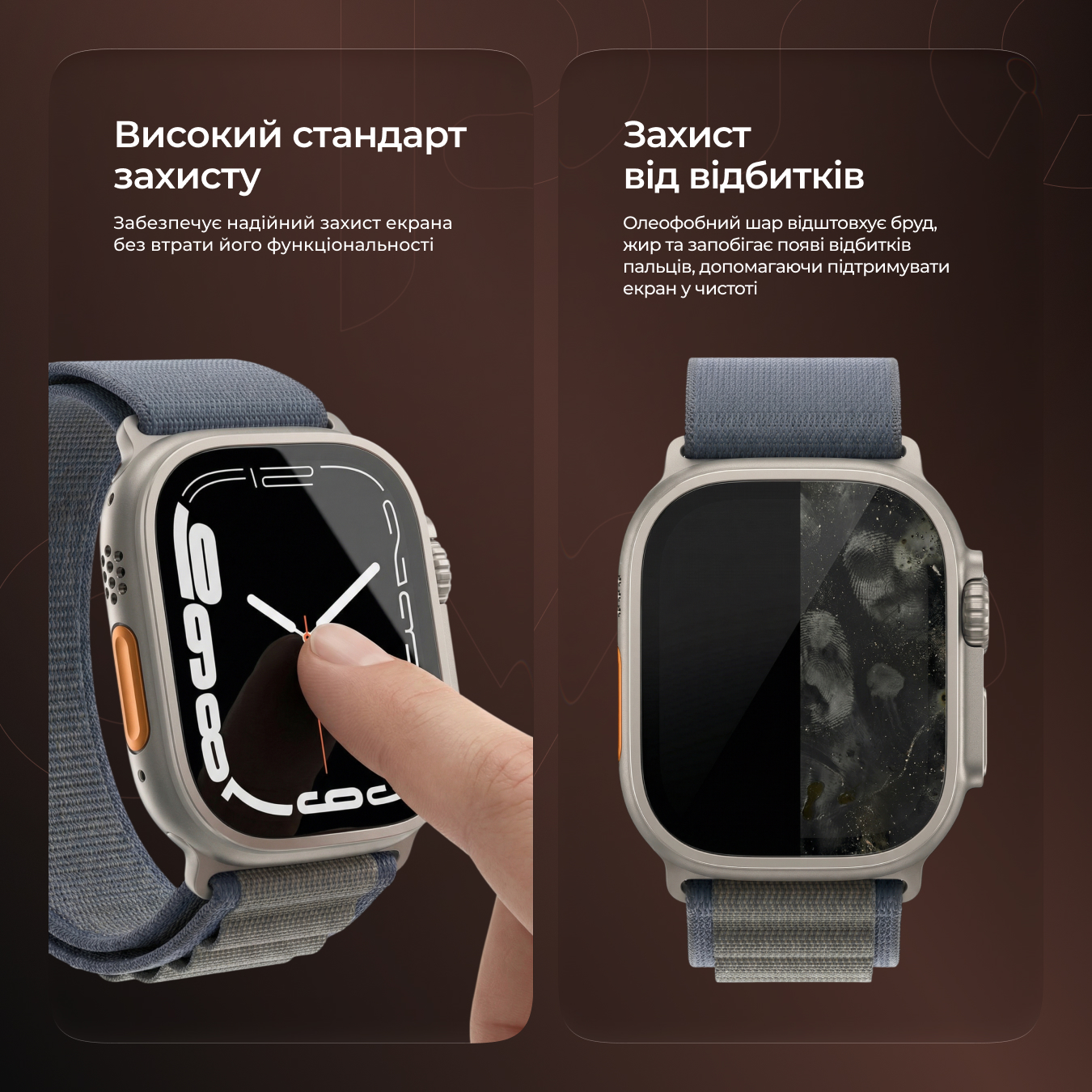 Proove Achilles Apple Watch Ultra відзначається високим стандартом захисту, що забезпечує надійний захист екрана годинника від пошкоджень. Олеофобне покриття запобігає забрудненню від відбитків пальців, плям і жиру, забезпечуючи чистоту та якість зображення.