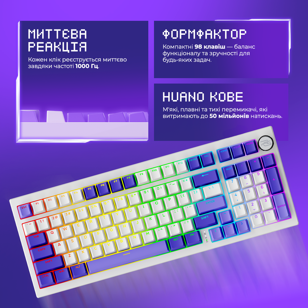 Клавиатура выполнена в современном форм-факторе с 98 клавишами, сочетающем полноценный набор и компактные размеры. Корпус из ABS придает прочность, а кейкапы из PBT устойчивы к истиранию и сохраняют текстуру даже после длительного использования. Аккуратная конструкция с равномерной подсветкой подчеркивает стиль и делает устройство привлекательным как для работы, так и для игр.