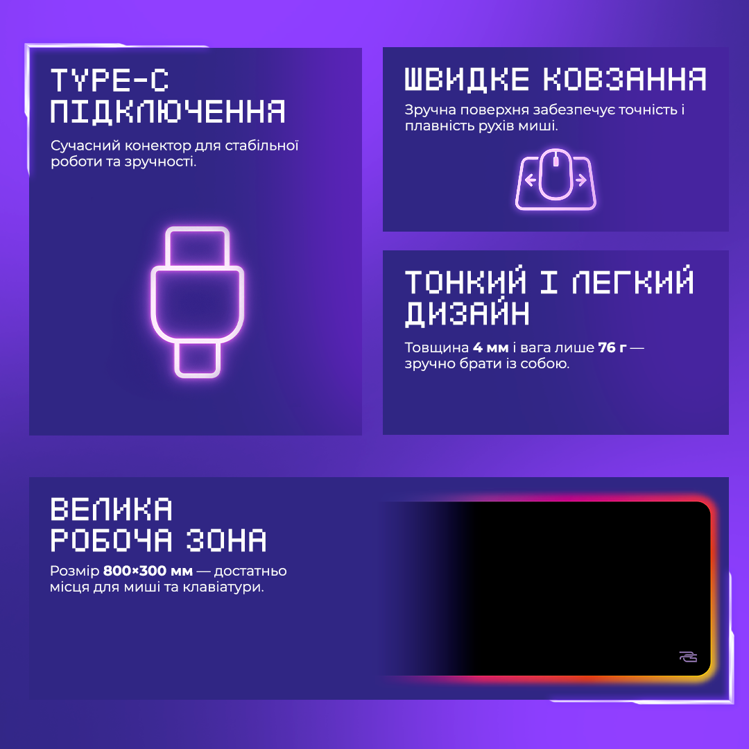- Материал: ткань+каучук; - Размер: 800x300x4 мм; - RGB-эффектов: 15; - Рабочее напряжение: 5V; - Коннектор: USB to Type-C; - Длина кабеля: 1.8 м; - Цвет: черный.
