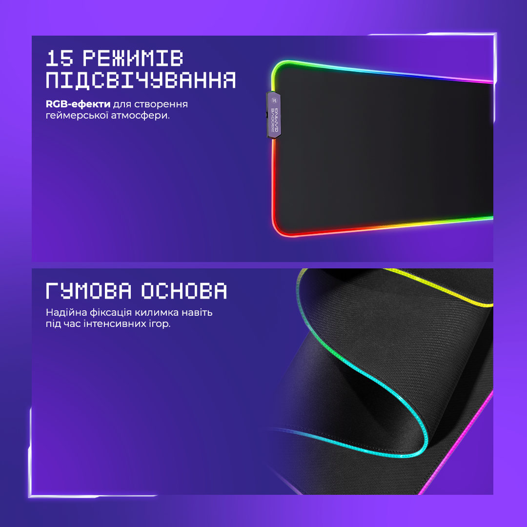 Одним из главных преимуществ этого коврика является наличие 15 RGB-эффектов, которые можно настраивать для создания уникальной игровой атмосферы. Управление этими эффектами осуществляется через USB to Type-C коннектор, что также обеспечивает питание. Кроме того, длина кабеля 1.8 метра позволяет удобно разместить коврик без ограничений в движении.