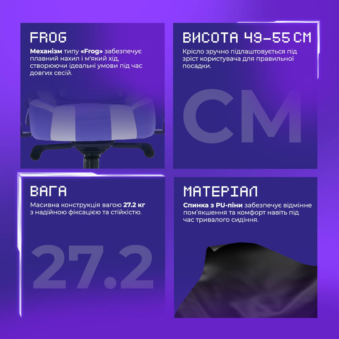 Рама кресла выполнена из сверхпрочного металлического сплава, поэтому Proove Gaming Geek не боится даже серьезных нагрузок. Колеса из бесшумного PU не создают неприятных звуков. Мягкая спинка из пенополиуретана обеспечивает оптимальную поддержку спины и комфорт.