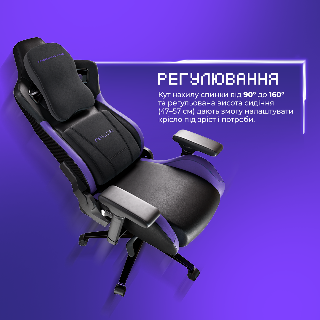 Proove Gaming Major оснащено газлифтом 4 класса, который смягчает нагрузку на спину геймера и позволяет настроить высоту под его рост. Спинка отклоняется на 160°, поэтому можно хорошо отдохнуть, а затем легко вернуть ее в стандартное положение.