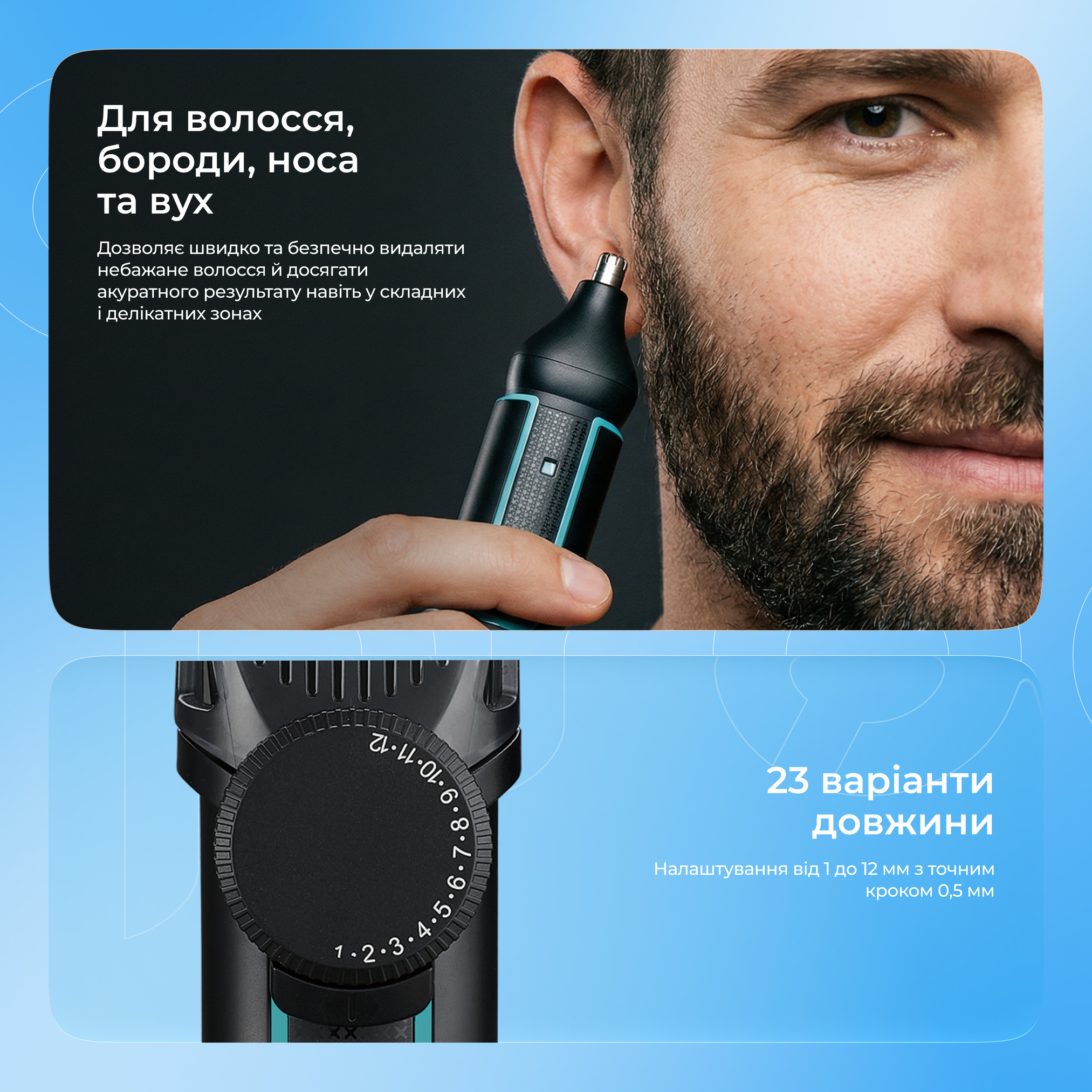 - Насадка с регулировкой длины реза обеспечивает точную настройку среза в диапазоне 1-12мм с шагом 0.5мм, что идеально подходит для бороды, усов и ухода за волосами.