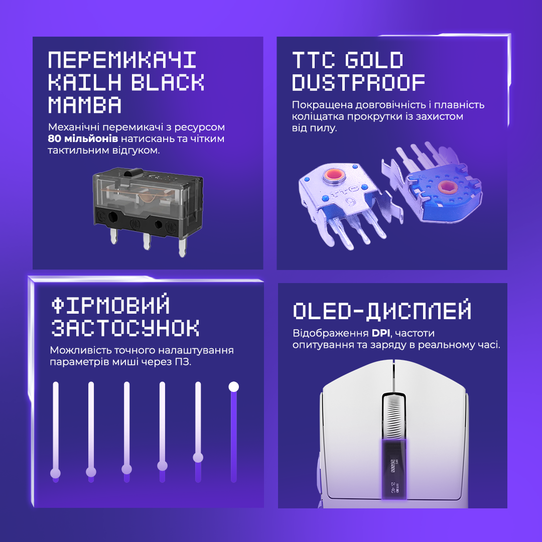 Мышь изготовлена из прочного ABS-пластика, а внутри – топовый набор компонентов: переключатели Kailh Black Mamba с ресурсом 80 миллионов кликов, энкодер TTC Gold Dustproof и сенсор PAW3395 – все для стабильной, длительной работы и абсолютного контроля.