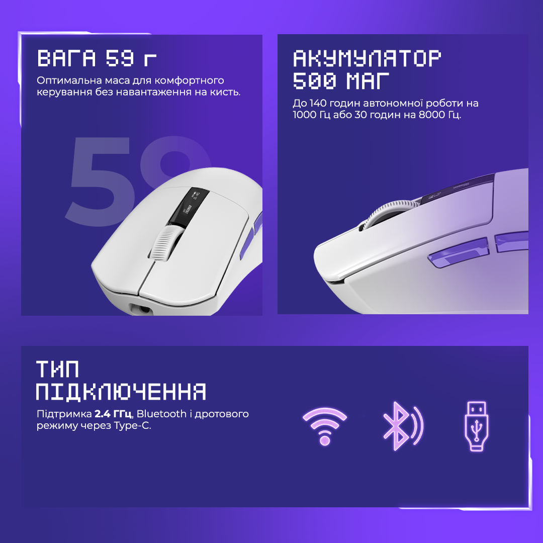 Благодаря частоте опроса до 8000 Гц, высокой чувствительности и ускорению 50G мышь мгновенно реагирует на каждое движение. Встроенный OLED-дисплей позволяет в реальном времени видеть DPI, заряд и тип подключения. Три варианта подключения: 2,4 ГГц, Bluetooth и USB делают Jester универсальной для любой ситуации, а аккумулятор на 500 мАч работает до 140 часов на 1000 Гц или до 30 часов на 8000 Гц.