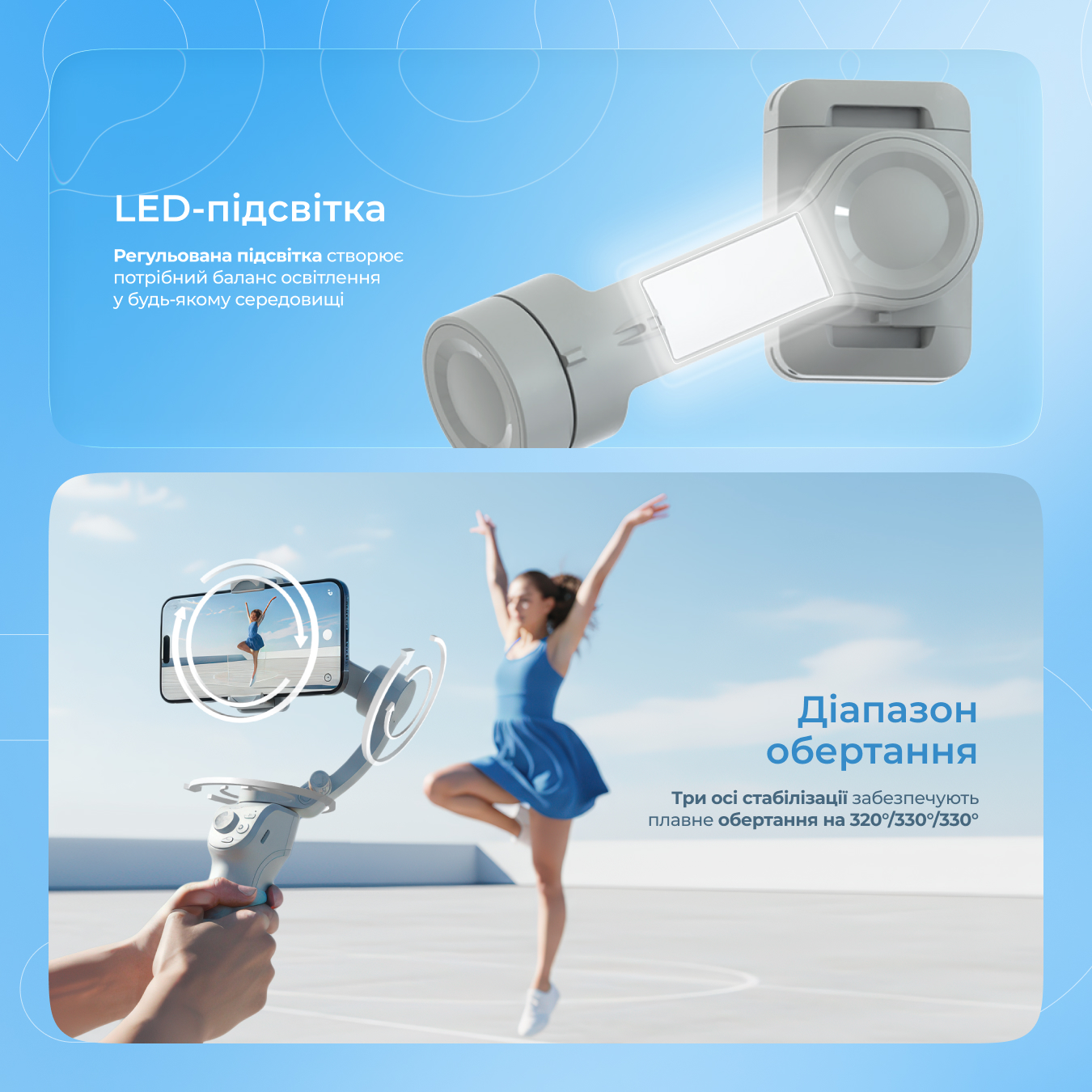 Джойстиками та кнопками на ручці стабілізатора можна керувати положенням пристрою, режимами знімання, а також активувати запис фото або відео, редагувати масштаб камери, не торкаючись дисплея ґаджета, просто синхронізувавши смартфон зі стабілізатором за допомогою Bluetooth-з'єднання і застосунку Gimbal Show. Також стабілізатор невеликий за розміром і добре сидить у руці, а завдяки розкладній тринозі, може зафіксуватися на поверхні.