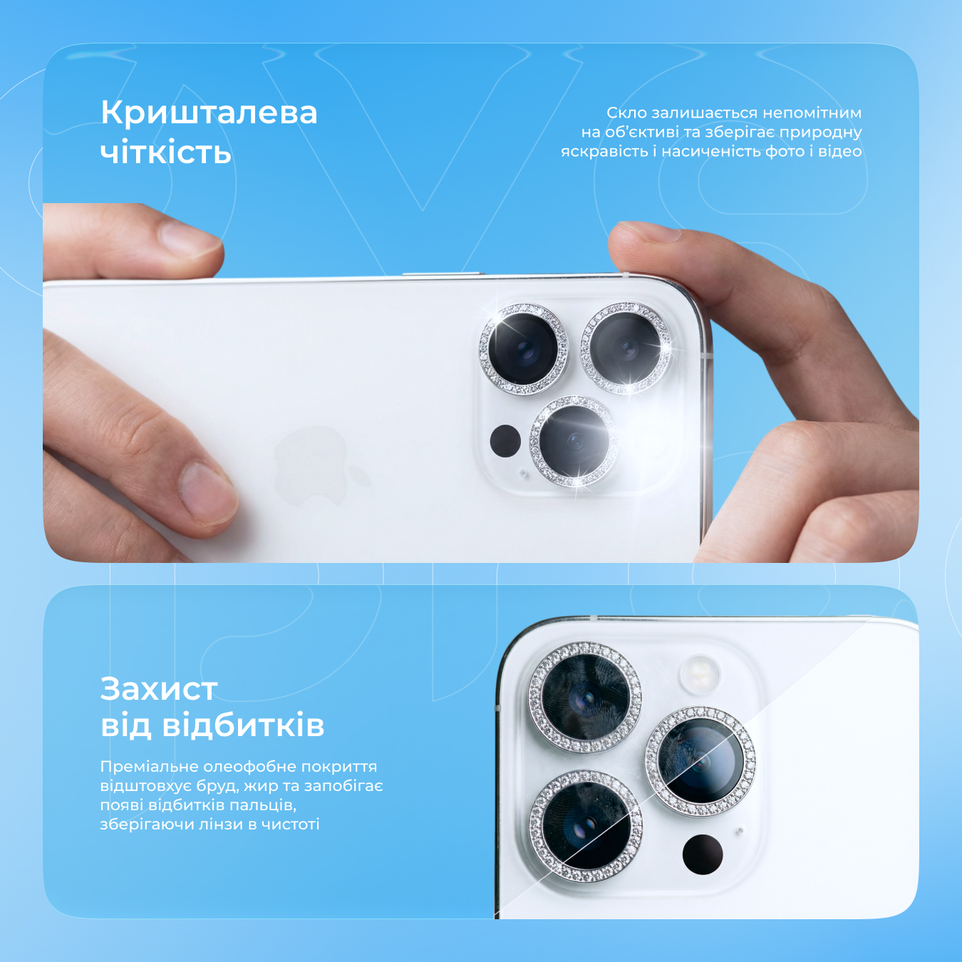 Кристально прозора структура скла не спотворює кольори фото та відео, а спеціальне олеофобне покриття запобігає появі плям і відбитків пальців. Камеру не потрібно постійно протирати — вона завжди готова до зйомки.