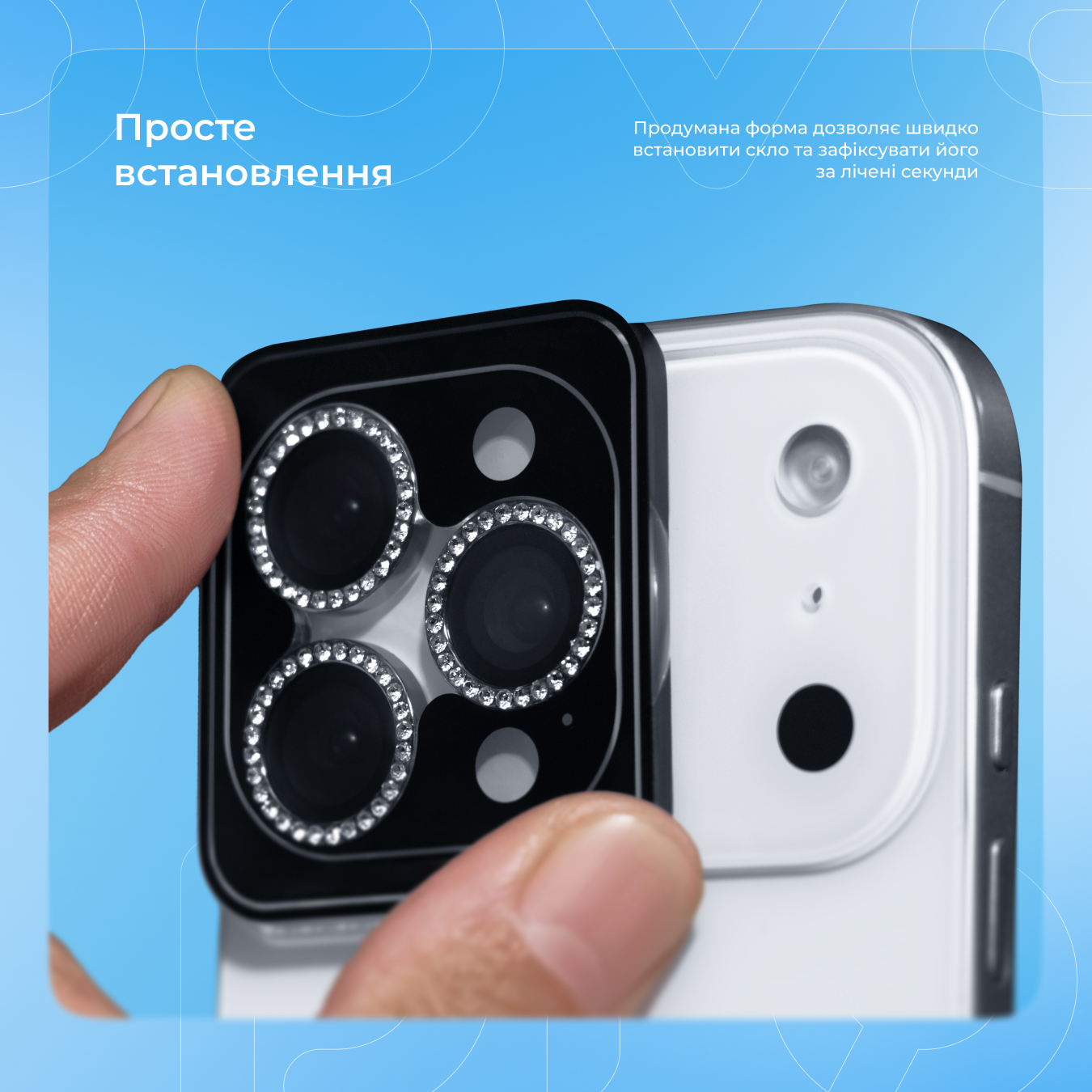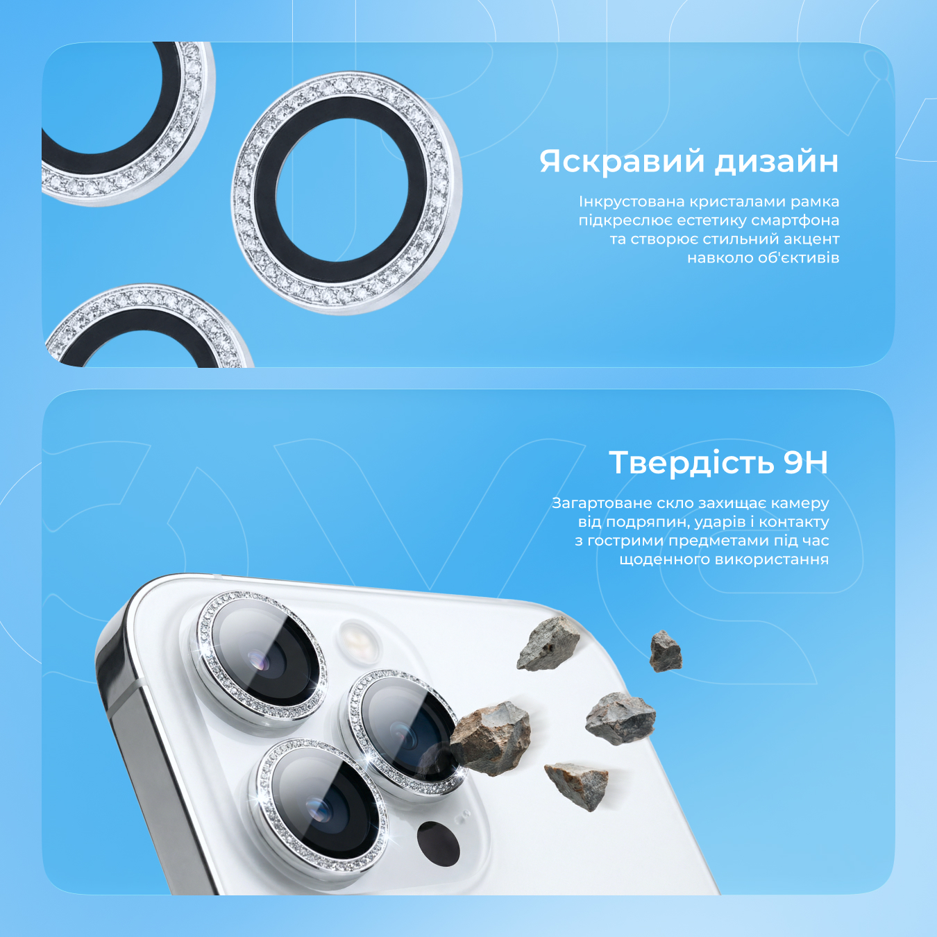 Скло має твердість 9H за шкалою Мооса, що забезпечує надійний захист лінз камери від подряпин і тріщин. Витончений дизайн із оздобленням блискучим камінням додає склу унікальний стиль, який привертає увагу, але не заважає експлуатації виробу.