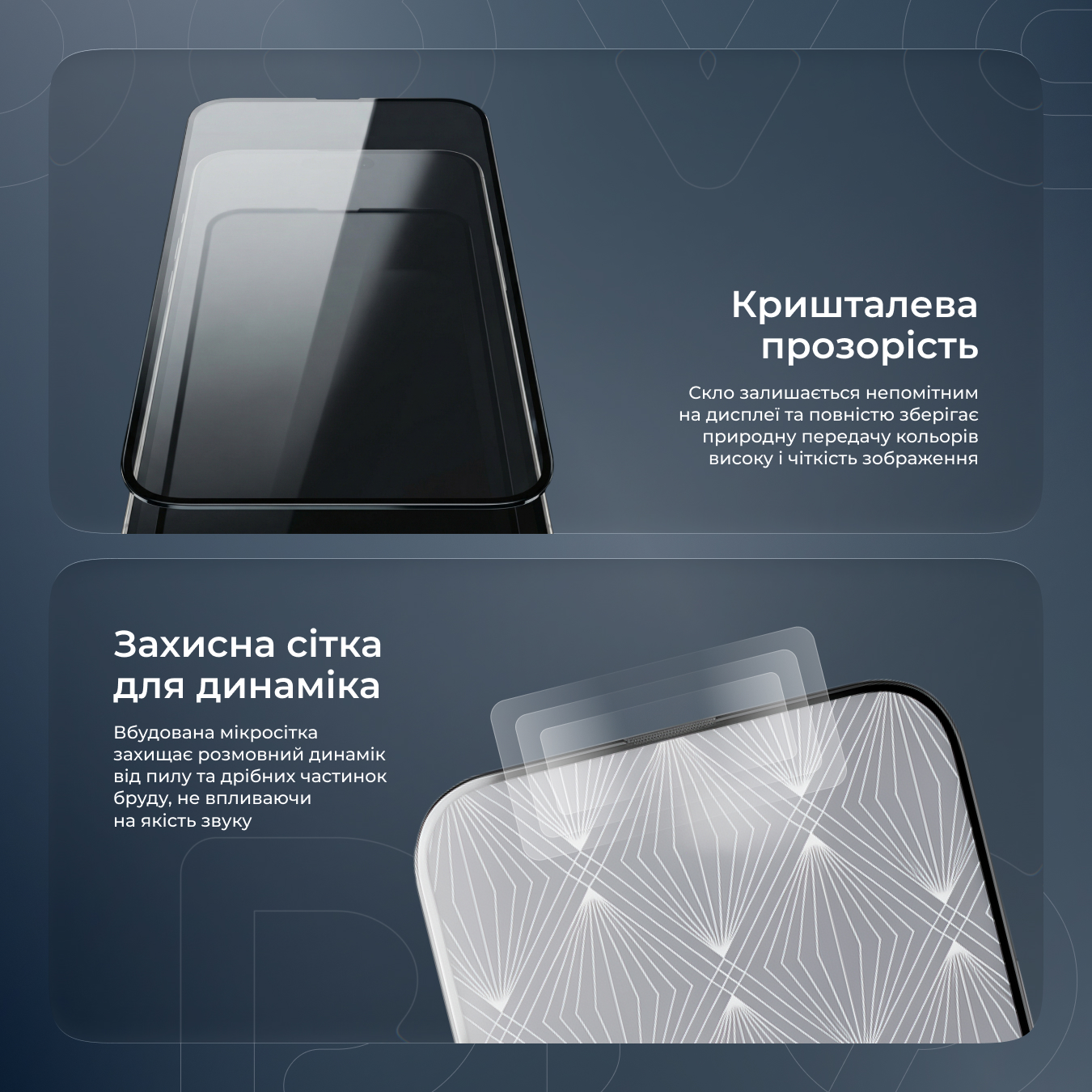 Скло має коефіцієнт твердості 9Н за шкалою Мооса. Воно оберігає дисплей смартфона від механічних пошкоджень, у тому числі від ударів. Стійке до появи подряпин та потертостей навіть за умов активного використання гаджета. Скло оснащене сіткою для захисту динаміка, що запобігає потраплянню пилу та вологи.
